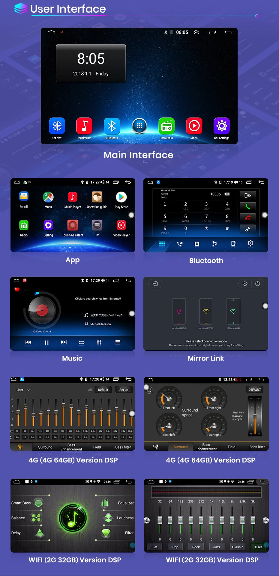 Flash + 32 GB Memory + Builtin Wifi + GPS Navigation + steering wheel control + Bluetooth + Builtin MIC + Hands Free external Microphone + FM + 1080P Video Play + HD 1024*600 + Support Tire pressure monitoring system