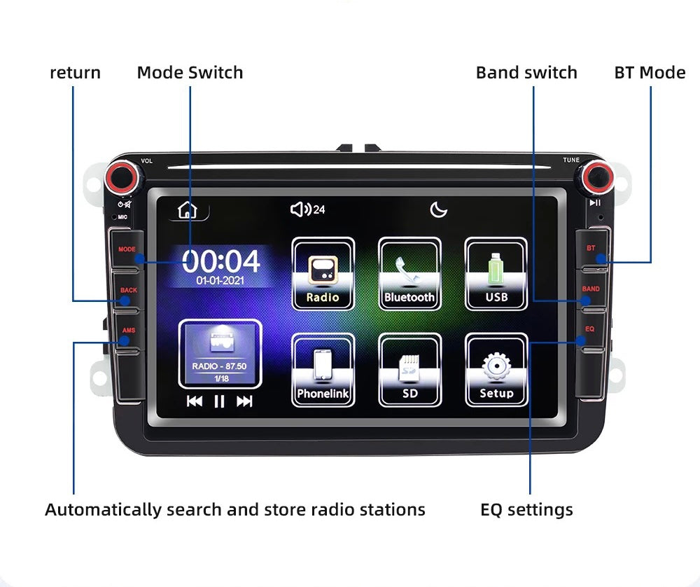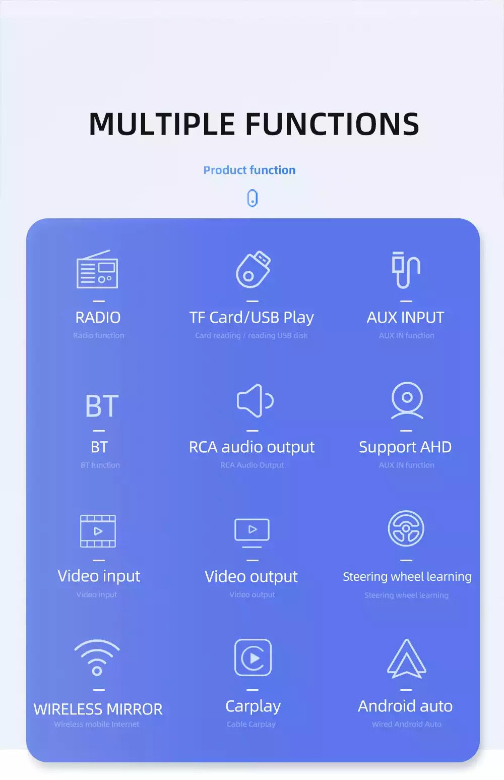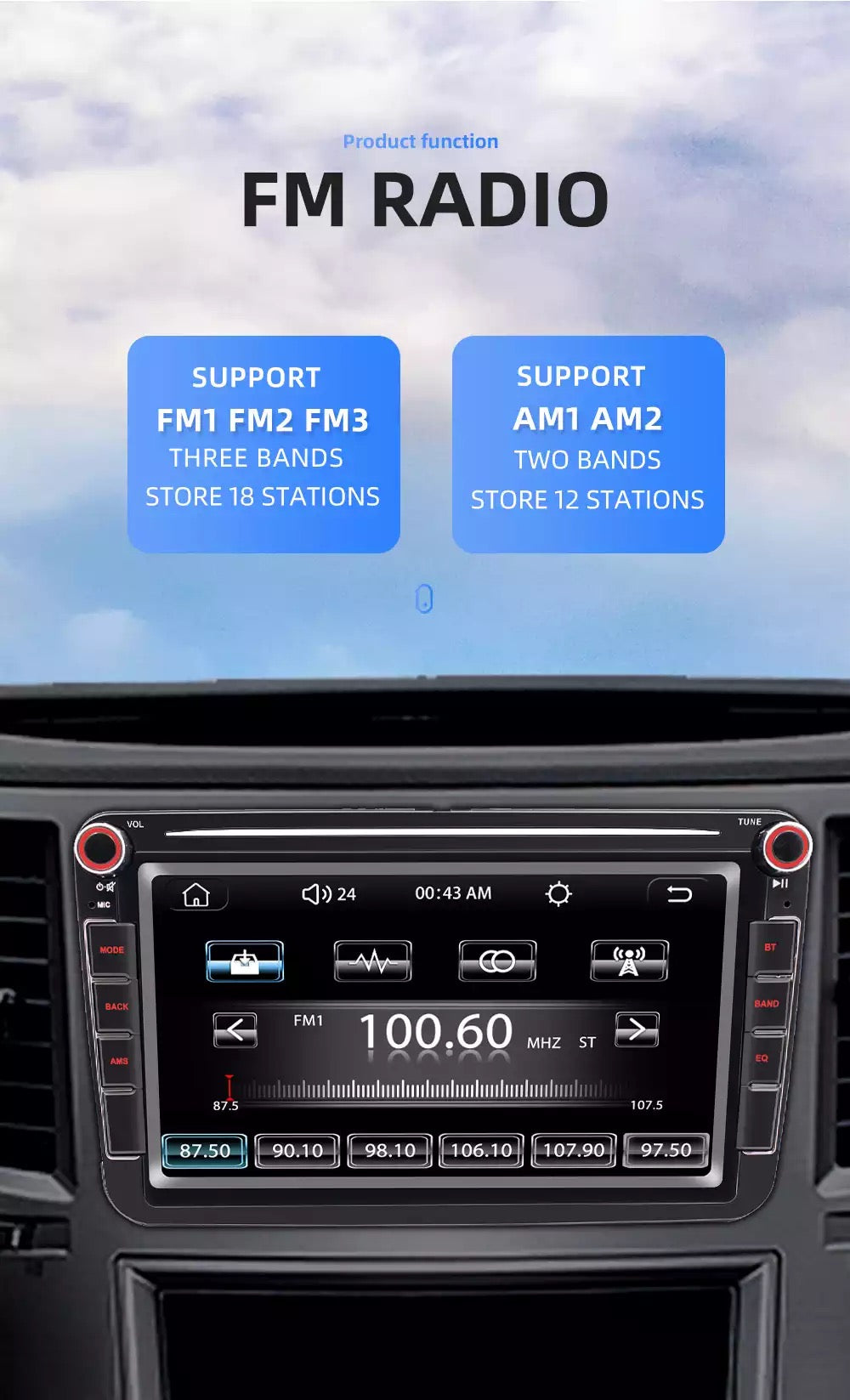 1、Wireless CarPlay / Android Auto Siri, Hands Free Calls,  Play Spotify, AM/FM radio, support FM1, FM2, FM3 three bands, can store up to 18 radio stations, AM AM1 AM2, can store up to 12 radio stations.