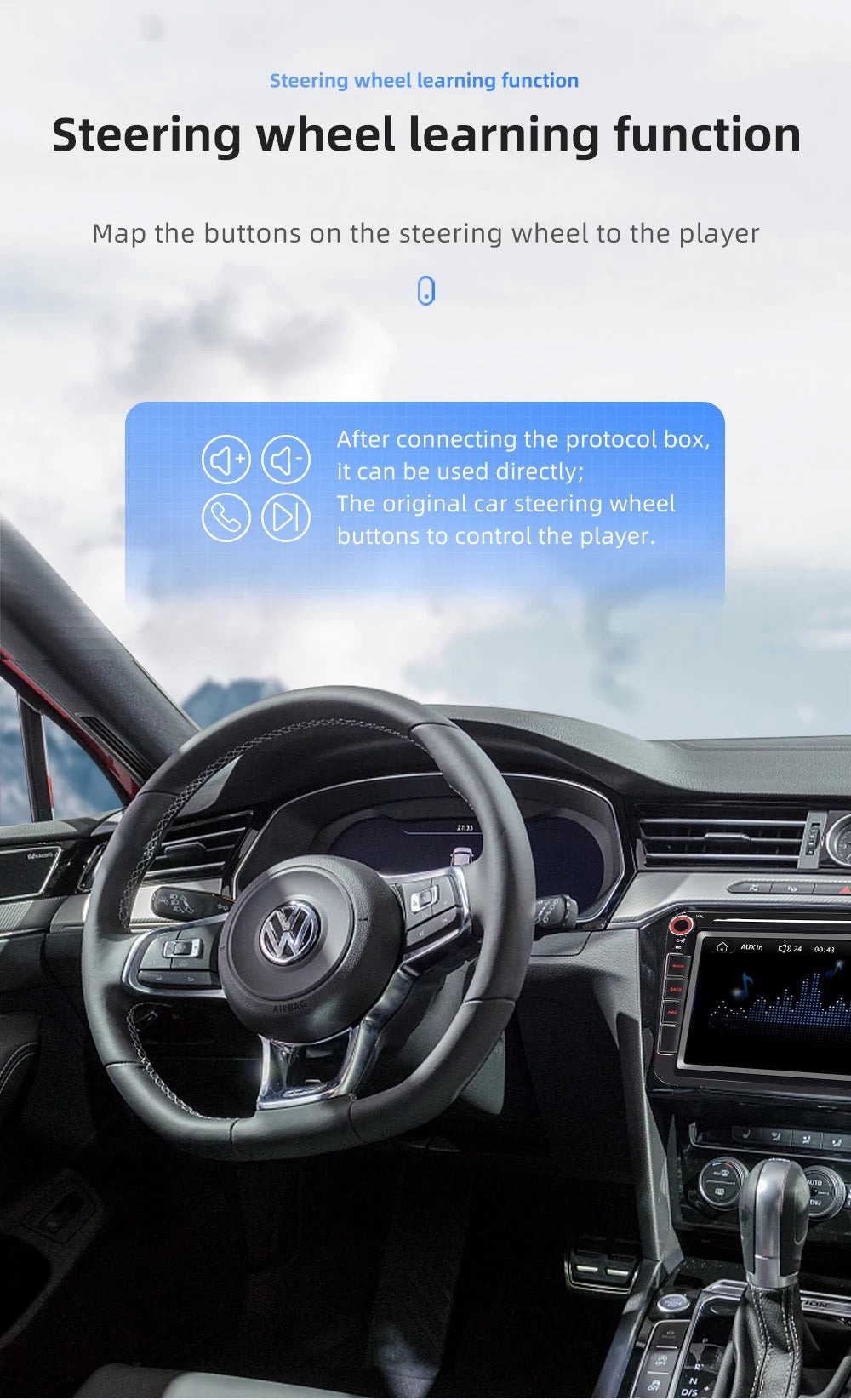 3、Muti-function: Video input/video output (same display) and the original car steering wheel learning function (the high version is directly connected to the protocol box, and the low version needs to learn the steering wheel buttons to use).
