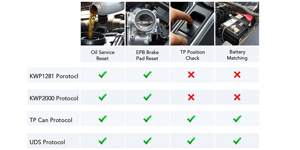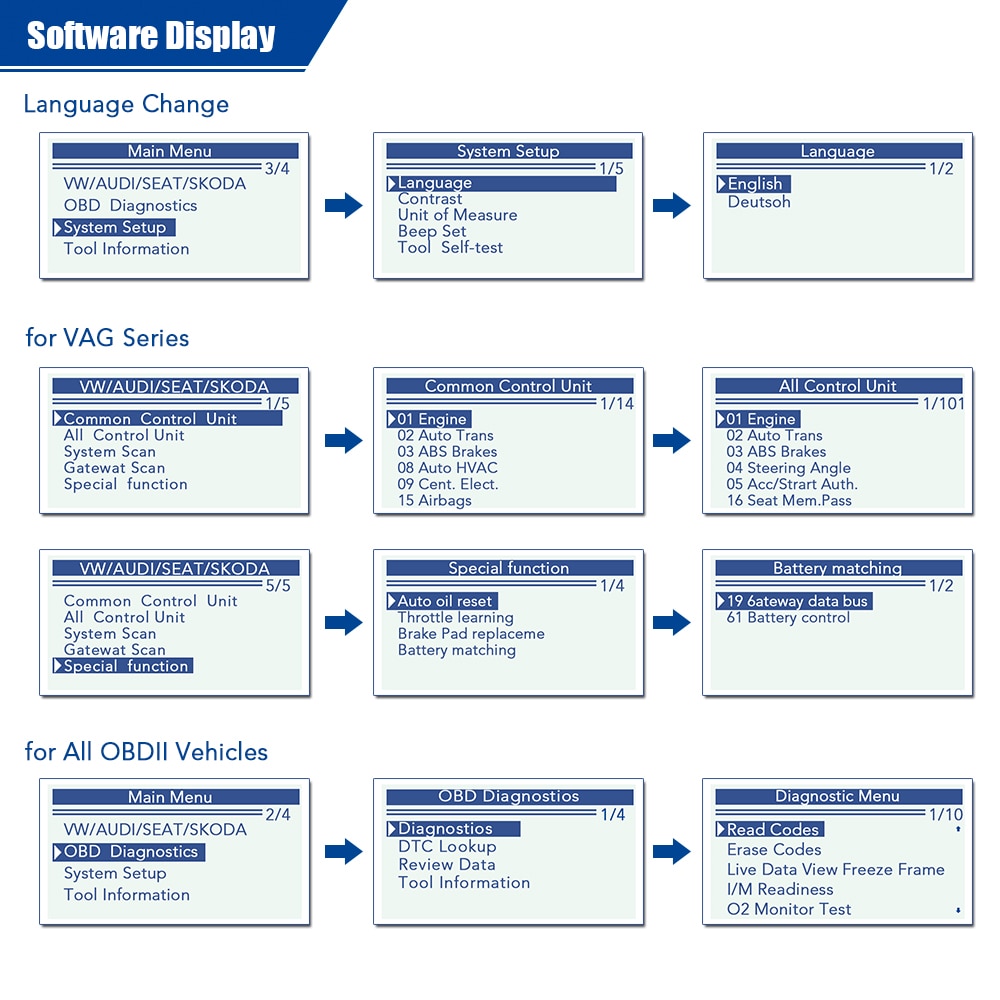 2. Specially designed for VAG users to perform special functions such as oil service light reset (service interval), EPB, TPS, Battery Match for replacing an old battery.