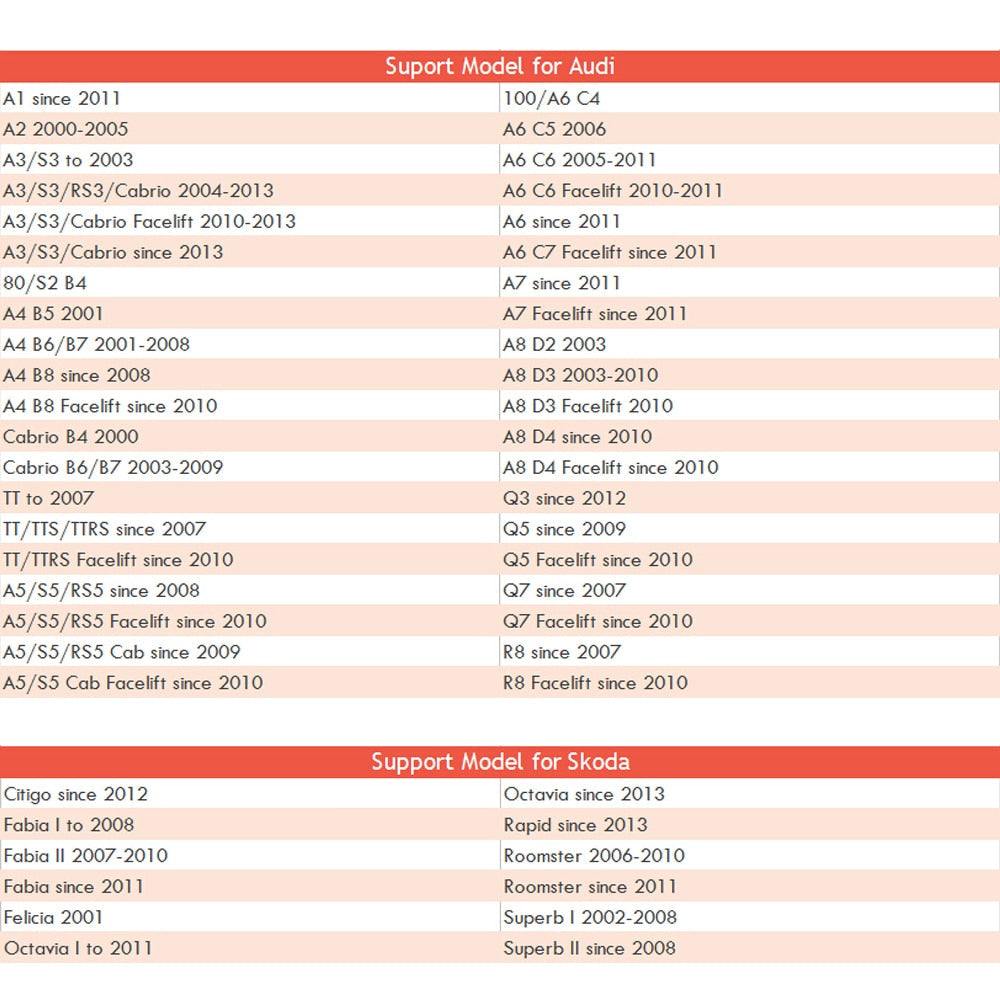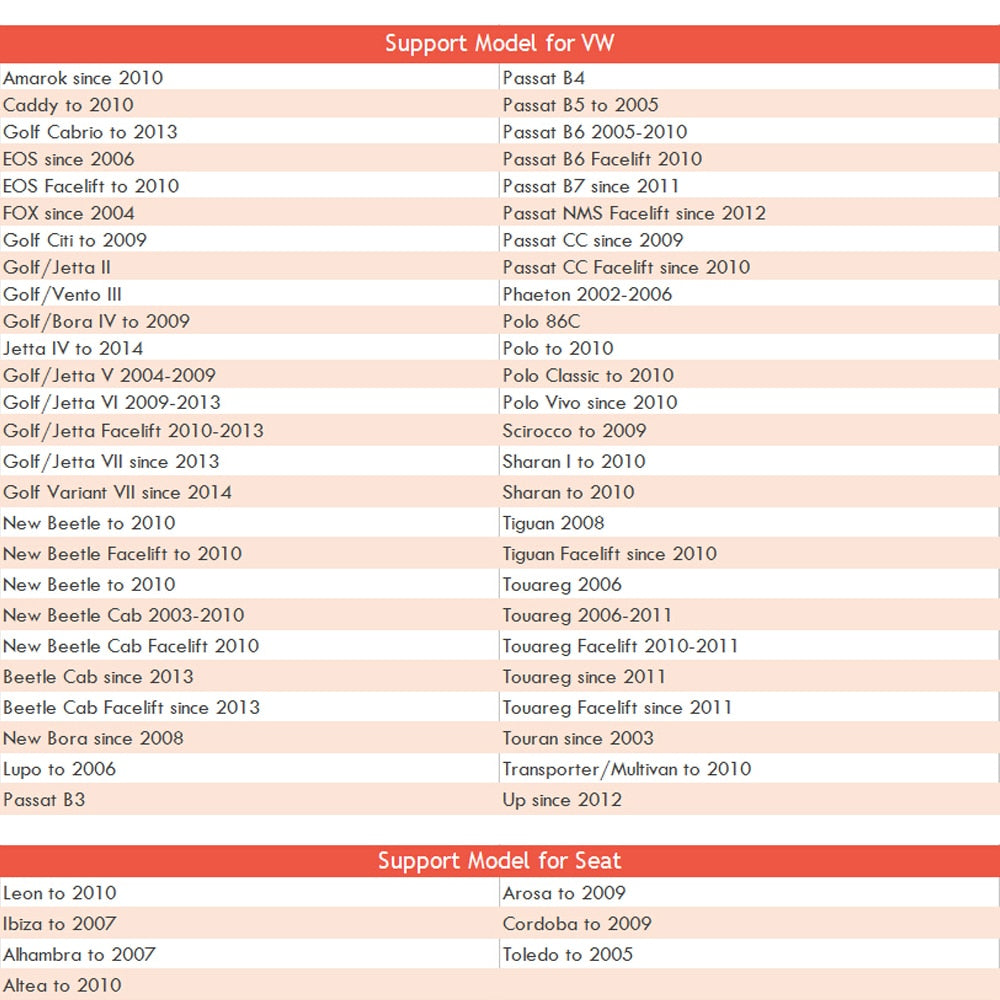 for VW (CC, EOS, Golf, GTI, Jetta, Passat, Phaeton, Polo, Rabbit, Sharan, Tiguan, Touran, Touareg);
