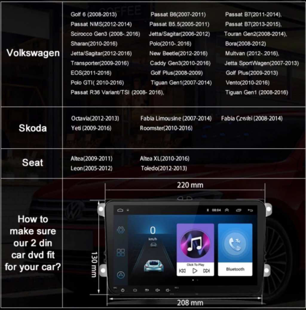 Suit for most Volkswagen cars up to For VW / Volkswagen / Passat / GOLF / Skoda / VW Polo / VW TIGUAN. VW Golf 5 MK5 will need to file few mm from plastic frame on both top corners.