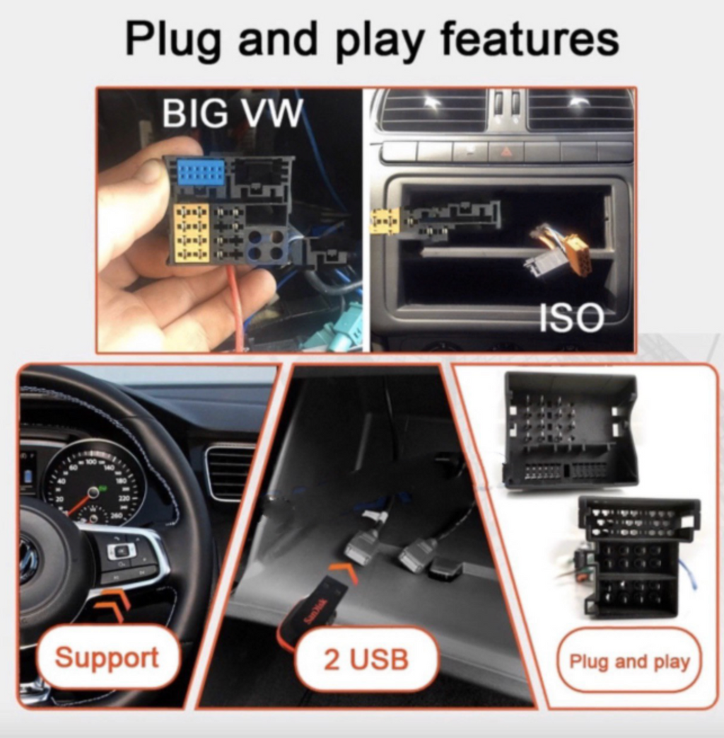 2G +32G Android 11 Stereo Double DIN 9' Head Unit Supports Apple CarPlay / Android Auto with Night Vision Reversing Camera suit for Volkswagen, Skoda Bluetooth, Radio, Video Player. Comes with 2 Plug and Play VW wiring harness heads, GPS Navigation, includes CANBUS, supports Steering wheel controls.